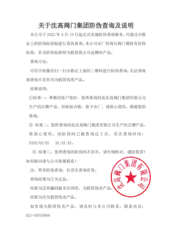 關(guān)于沈高閥門集團(tuán)防偽查詢及說明